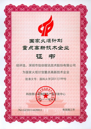 2011年11月,科技部火炬高技術產業開發中心發布2011年國家火炬計劃重點高新技術企業評審結果,佳創視訊被評選為“國家火炬計劃重點高新技術企業”,是此次深圳市通過評選的27家企業之一。